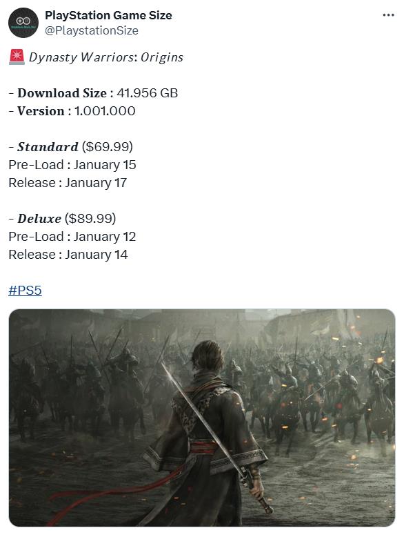 知名推主PlayStation Game Size近日发文透露,《真无双:起源》PS5版的下载容量大小为41.956GB,版本号1.001.000,标准版预计1月15日开启预载,1月17日解锁,豪华版将提前3天,1月12日开启预载,1月14日解锁。