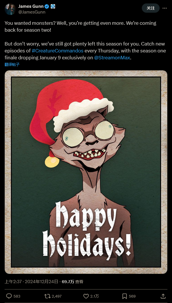 他在帖子上写道:“你们想要怪物?好消息,你们将会获得更多!我们将以第二季回归!不过别担心,这一季我们还有更多内容等着您……第一季大结局将于 1 月 9 日在 Max 上独家播出。”