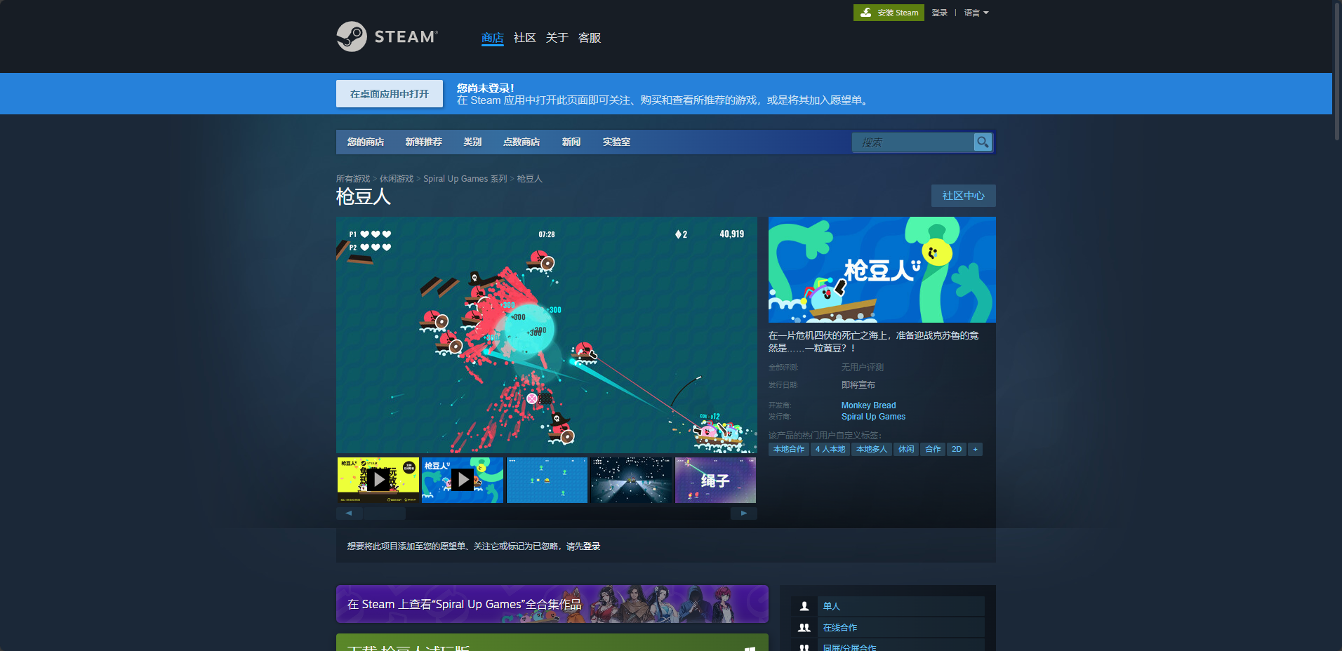 《枪豆人》是一款2D冒险射击游戏,而这款游戏的官网地址就是Steam平台的购买页面,进入到这个游戏的购买页面基本上就能知道所有这款游戏的信息。