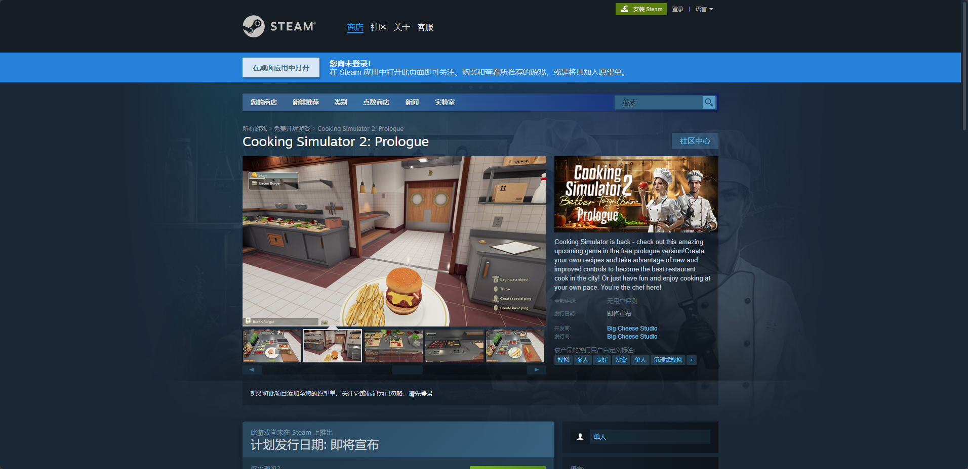 Steam平台需要先安装Steam平台,之后注册一个账号登录,然后搜索“Cooking Simulator 2: Prologue”进入商店购买页面。