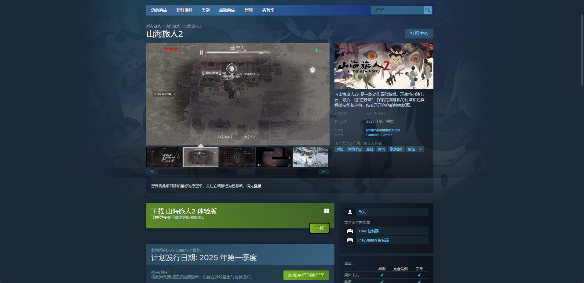 《山海旅人2》目前仅在Steam平台上线,Steam版上架发布时间为2025年的春季,也就是明年的一月到三月左右。