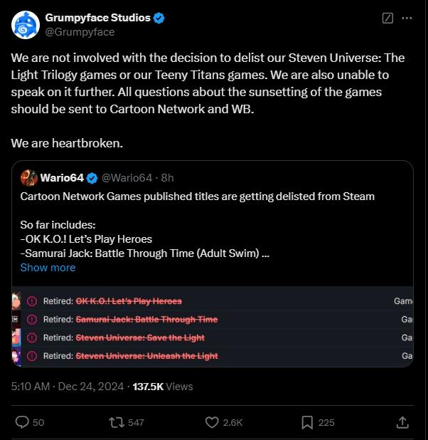 对此华纳兄弟官方并未做出进一步解释,而被下架游戏的开发公司之一则在推特上表示:“我们并没有参与下架《宇宙小子:光明三部曲》游戏或《少年泰坦》游戏的决定,我们也无法就此发表更多言论。有关游戏下架的所有问题都应发送给卡通频道和华纳兄弟。我们非常伤心。”
