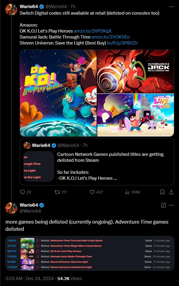 名为“Wario64”的推特用户最新发现该情况,从他的推文中可以看到,华纳已将《探险活宝:芬恩和杰克的史诗任务》、《探险活宝:魔术师的头脑游戏》、《武士杰克:时空之战》、《OK KO!让我们扮演英雄》、《宇宙小子:拯救光明》和《宇宙小子:释放光明》这几款游戏在PC及主机平台下架,目前这几款游戏的Steam页面也都显示停售而无法购买(但有3款游戏的Switch数字版仍可在零售平台购买到)。