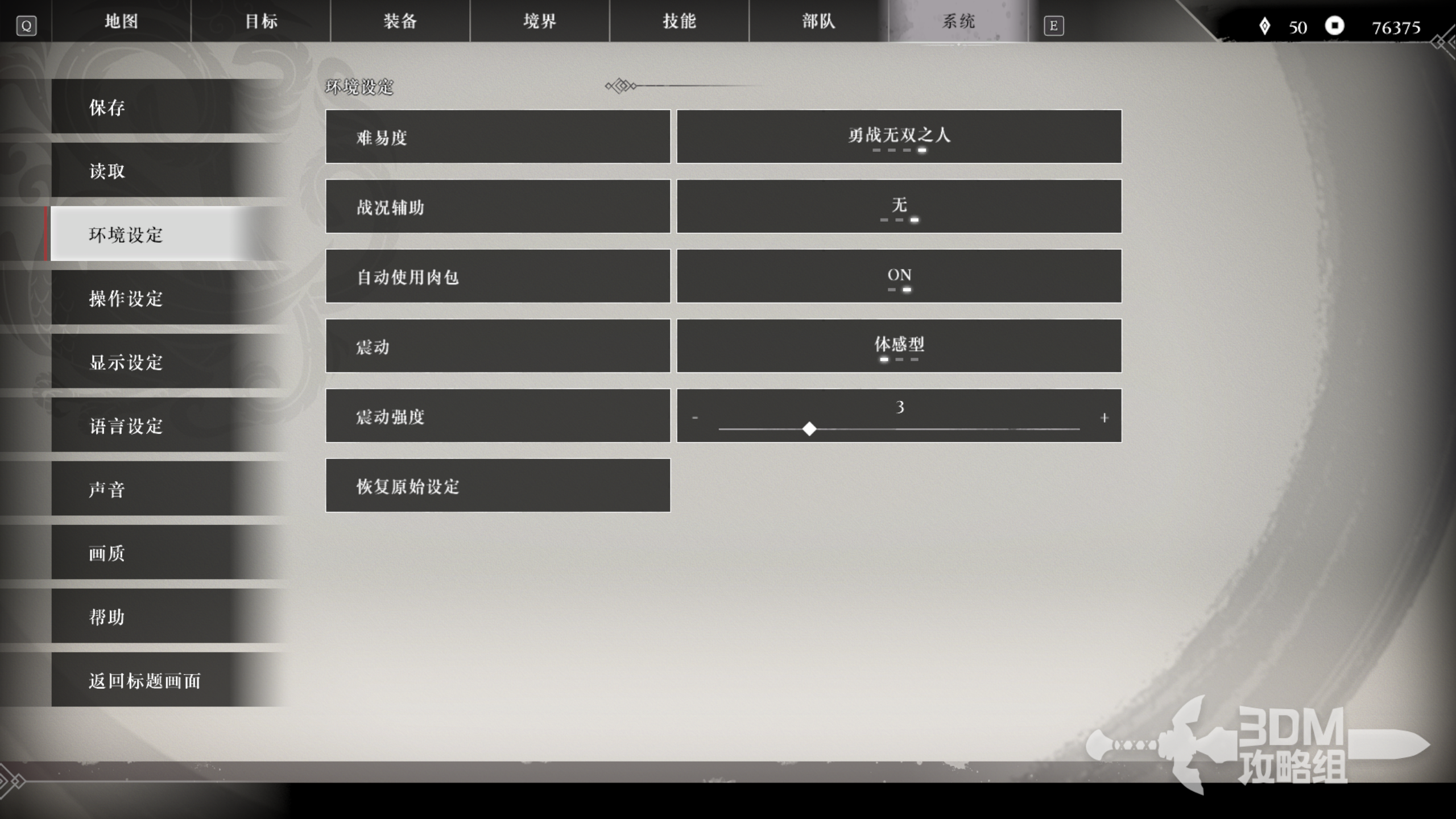 可以在【设置-环境设定-难易度】进行难度更改。