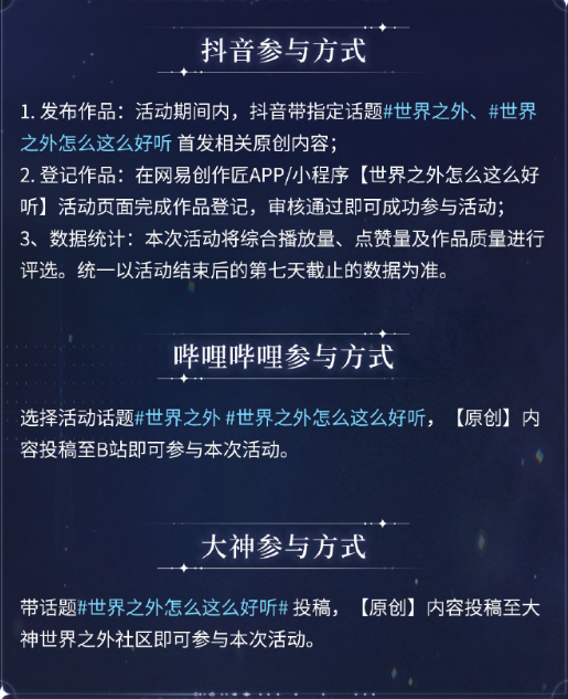 世界之外年度音乐挑战赛,将在B站、抖音、网易大神三平台同步开启!投稿赢取现金及线下门店好礼!