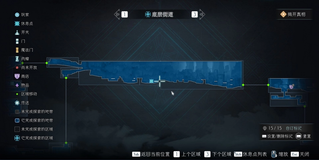《终焉之玛格诺利亚:雾中盛放之花》作为一款横向解谜探索游戏,有一个全探索地图还是很重要的,比如底层街道就需要一个全探索地图,这里可以获得二段跳和冲刺,另外在这里也可以第一次见到露薇。
