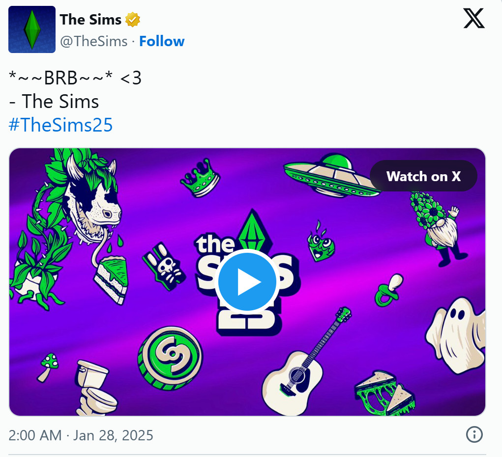 周一,《模拟人生》官推还发布了一条消息“BRB”,并附上一段动画,展示了《模拟人生2》的操作菜单,然后是《模拟人生》包装盒上的彩色方形背景。