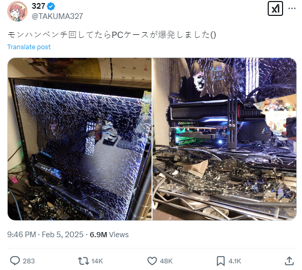 日本玩家TAKUMA327发推称,他在使用硬件测试工具时,电脑机箱突然爆炸。他还晒出了现场图,可以看到现场一片狼藉,机箱侧面玻璃已碎裂。