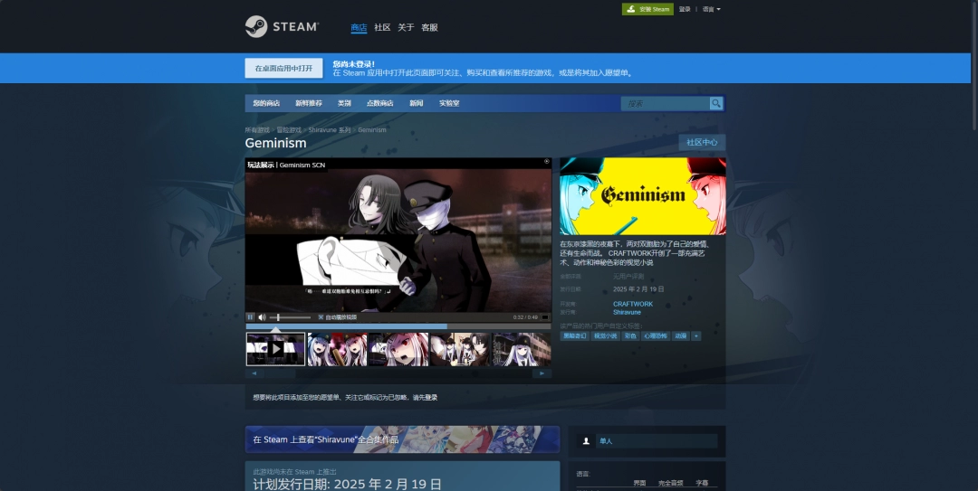 《Geminism》是CRAFTWORK开发、Shiravune发行的视觉小说游戏,而这款游戏的下载网址就是购买平台的购买页面,比如Steam版就是在购买页面购买之后,点击页面中的马上开玩就可以开始下载了。
