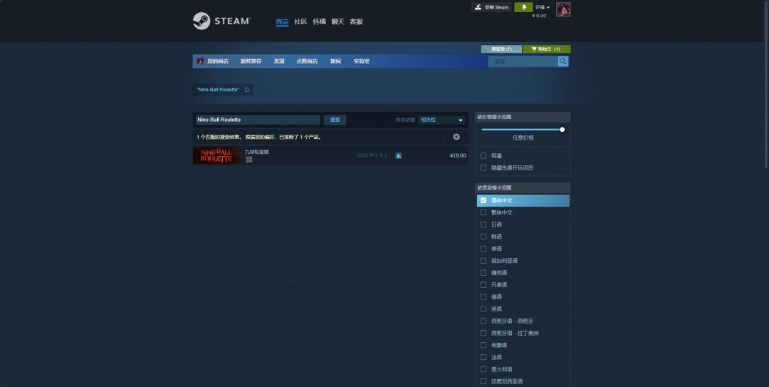 《九球轮盘赌》这款游戏在steam上的英文名字就是“Nine-Ball Roulette”,只需要在steam搜索框直接搜索就行了。