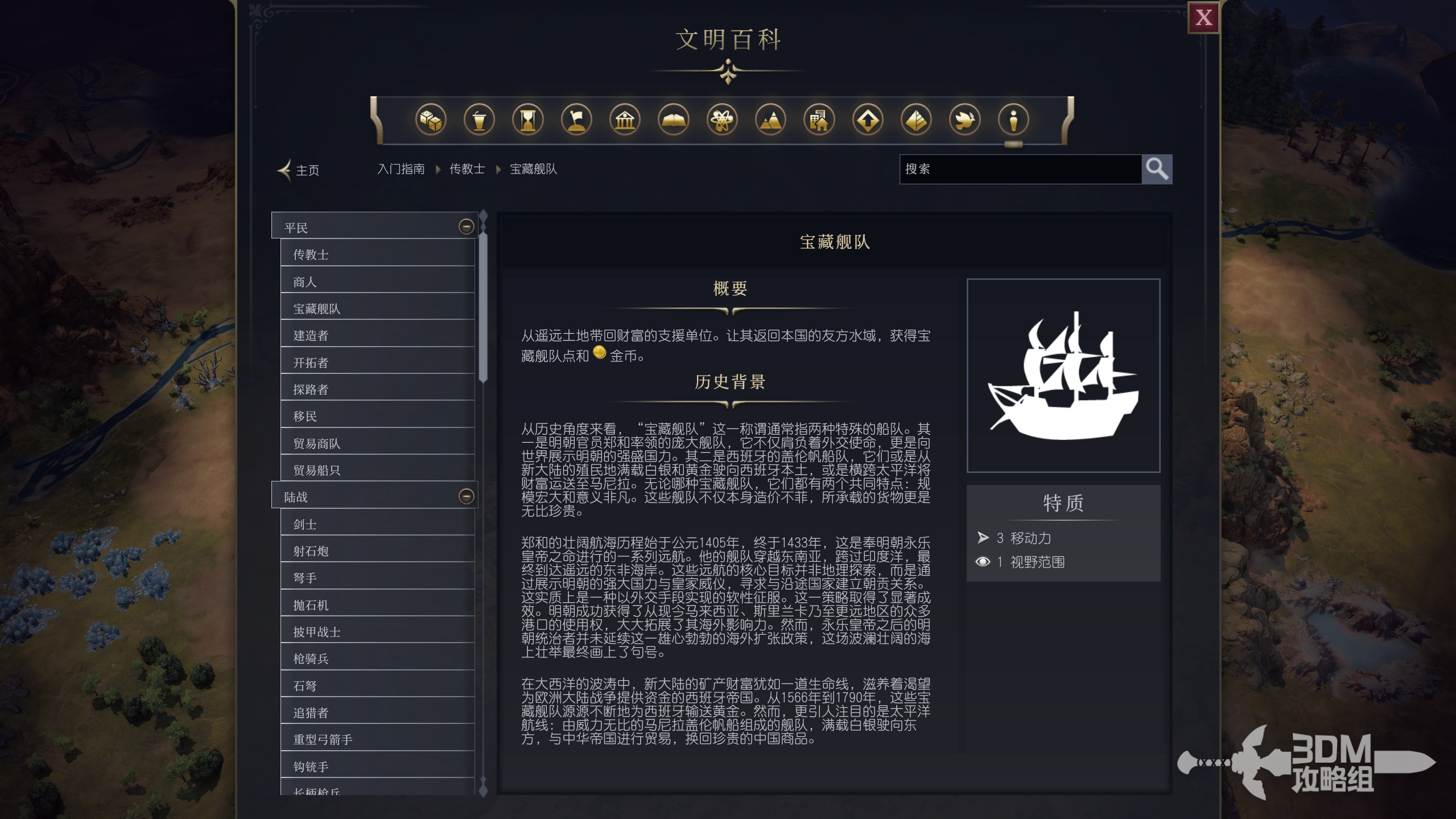 《文明7》中的主要单位分为平民单位以及军事单位两种,平民单位负责文明的建设发展,平民宝藏舰队就是平民单位的一种,然而很多玩家不知道平民宝藏舰队的作用,首先平民宝藏舰队是从遥远土地带回财富的支援单位。
