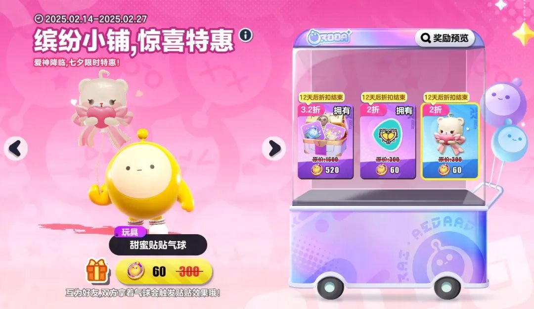 爱神将临,情人节限时特惠!2月14日-2月27日,“缤纷小铺”上架3款全新情人节直售好物,活动期间享有超低折扣,消耗蛋币即可直接购买。