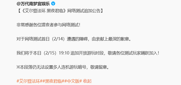 今早我们报道了《艾尔登法环:黑夜君临》首轮测试就出现了服务器问题。首轮测试始于昨晚7点,10点结束,但因为开服涌入了大量玩家,导致服务器下线维护了两个小时,这意味着首轮测试仅仅持续了一个小时而已,剩下两个小时都是在维护服务器。维护结束后,万代官方发布公告,向玩家道歉,同时表示将进行额外的测试以补偿第一轮测试的玩家。