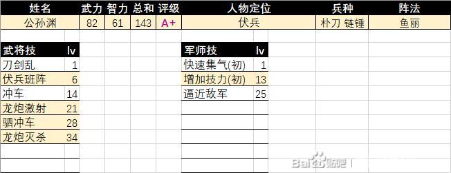 公孙家扛把子,班阵伏兵将,中武及格智,班阵性价比高,还有龙激龙灭四驱车清兵,增技初也能用。