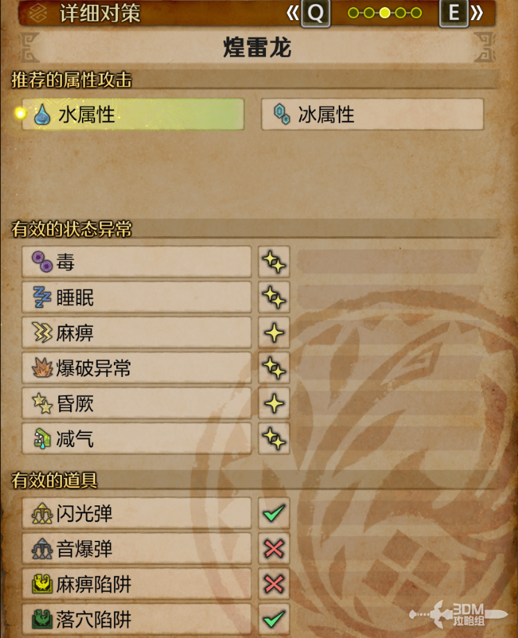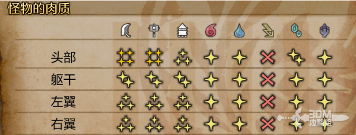 煌雷龙的弱点部位分别是头部,双翼和尾部,它的弱点属性就是水属性和冰属性,对负面状态的抗性比较均衡。