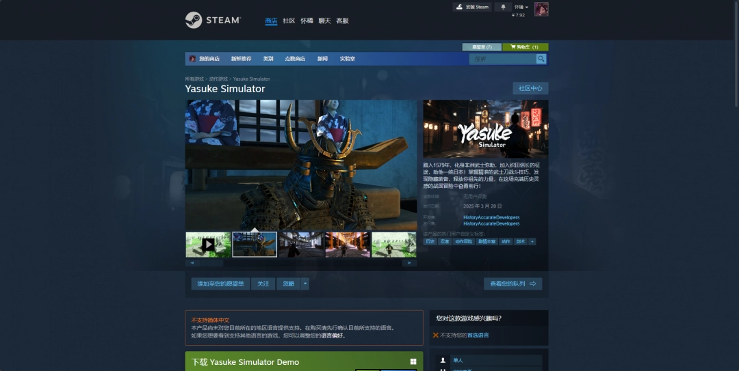 《弥助模拟器》是一款由HistoryAccurateDevelopers制作并发行的模拟游戏,而这款游戏想要下载还是比较麻烦的,下载的第一步就是安装Steam平台,然后注册账号登录,并且搜索“Yasuke Simulator”,然后点击购买,之后点马上开玩即可。