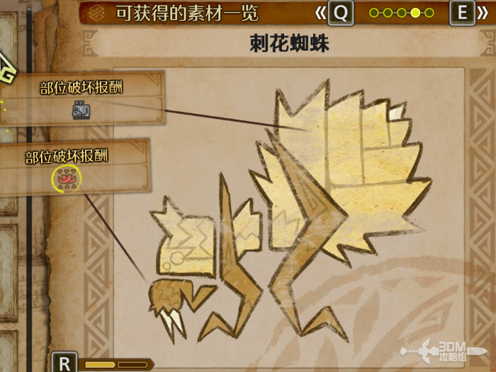 头盔部位需要刺花蜘蛛狩猎证Sx1,刺花蜘蛛的坚壳x3,刺花蜘蛛的锐爪x2。
