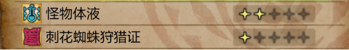 手甲部位需要刺花蜘蛛狩猎证Sx1,刺花蜘蛛的锐爪x1,刺花蜘蛛上等尾棘x1,怪物浓液x1。