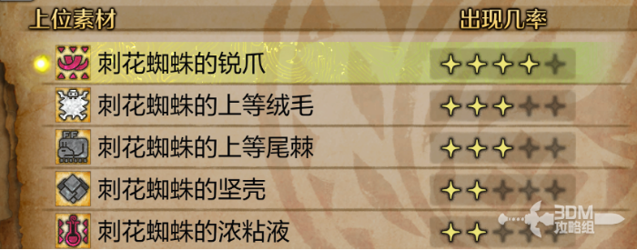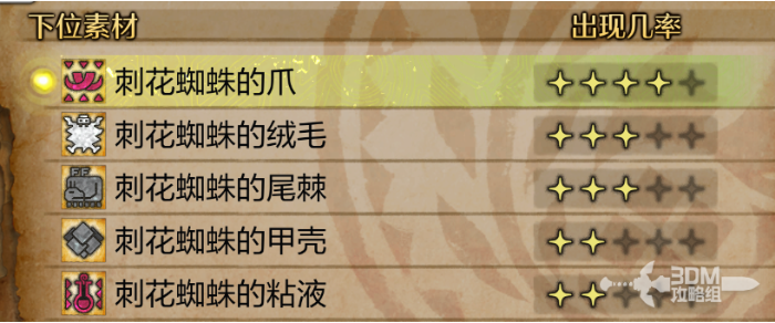 盔甲部位需要刺花蜘蛛上等绒毛x2,刺花蜘蛛的坚壳x2,刺花蜘蛛的浓粘液x1,刺花蜘蛛上等尾棘x1。