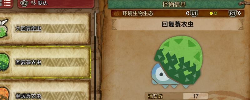 《怪物猎人:荒野》中的回复蓑衣虫是游戏里重要的环境生物,然而很多玩家不清楚回复蓑衣虫的收集方法,首先,它的捕获难度:路边随处可见,难度0/10,可在天堑沙原丰饶期白昼16区西北部帐篷台阶下捕获。