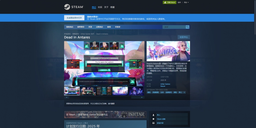 《Dead in Antares》是一款由Ishtar Games制作、Nacon发行的回合制生存管理游戏,而这款游戏的官网地址就是Steam平台的购买页面,进入到这个游戏的购买页面基本上就能知道所有这款游戏的信息。