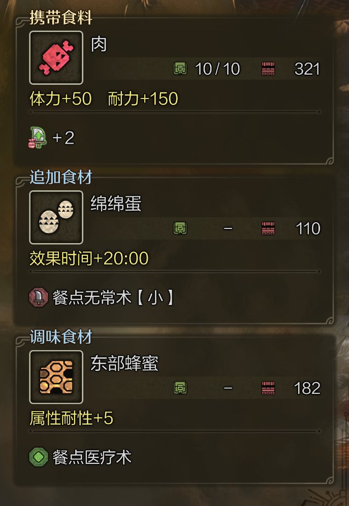 最后,携带食料+特产换来的追加食材+大蜜虫爆的东部蜂蜜,你就能看到猎人打开锅盖的完美笑容。