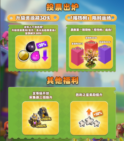 同时,为了让玩家们感受到“飞升”的乐趣,飞升节期间升级资源费用金币、圣水和黑油全部直减30%!更有票数第一障碍物摇钱树隆重返场!