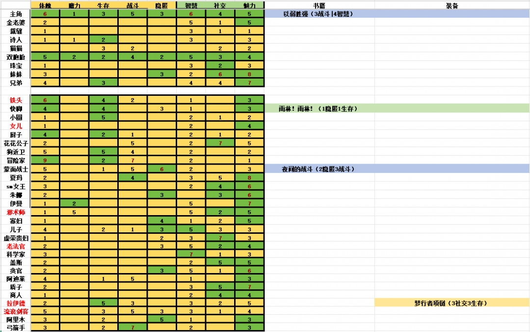 所有角色属性均按照满命运商店、装扮后计算,儿子的属性按照311选项计算,绿色格子为装扮提升的属性,红色字体为该角色的优势属性。