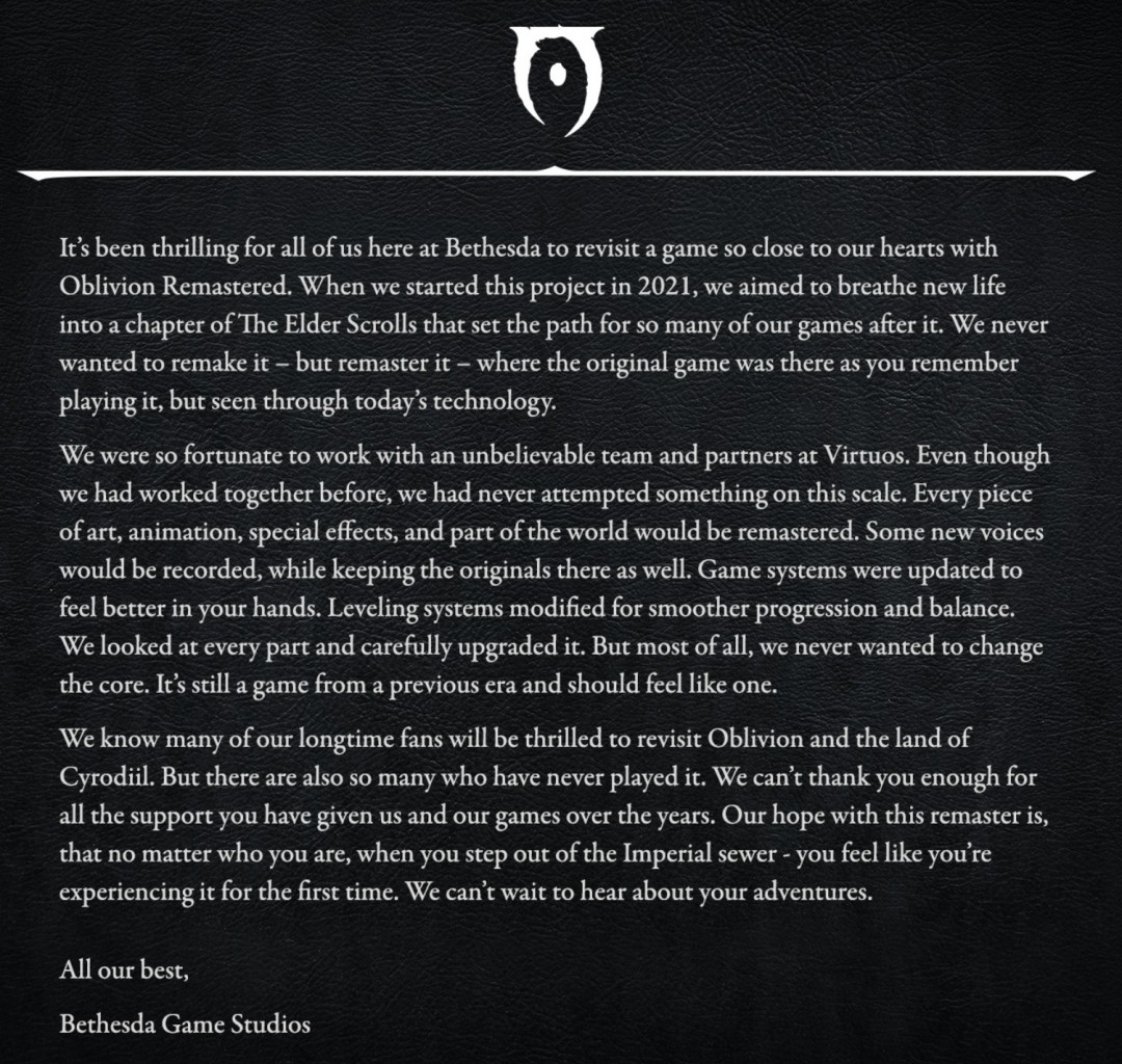 官方表示:“对于B社所有人来说,打造《上古卷轴4:重制版》是一个令人兴奋的事情。当我们在2021年开启该项目时,我们的目标是为《上古卷轴4》每个章节注入新活力。我们从未想过要完全重制它,只是在保留原版核心体验的前提下,运用现代技术进行升级。”