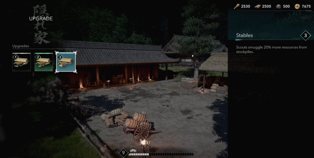 刚开始的时候,走私一个库存需要两名斥候。升级藏身处的马厩可以减少走私库存所需的斥候数量——2级时降至一名斥候——并且3级时从库存中获得的资源数量增加20%。