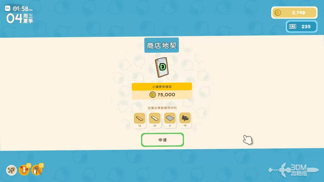 地契购买完成之后需要玩家找一个地方放置 ,放置成功之后需要投入建筑材料,建筑材料集齐之后就可以开始自动建造。