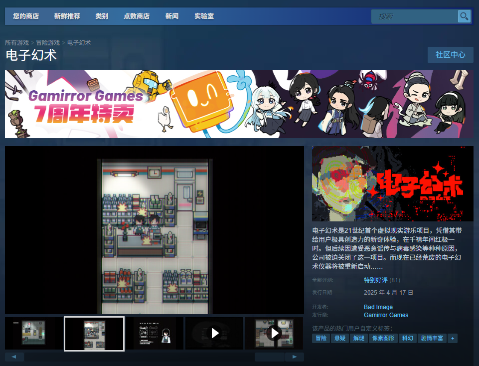 《电子幻术》是一款由Gamirror Games开发的像素风格微恐解谜游戏,而这款游戏的官网地址就是Steam平台的购买页面,进入到这个游戏的购买页面基本上就能知道所有这款游戏的信息。