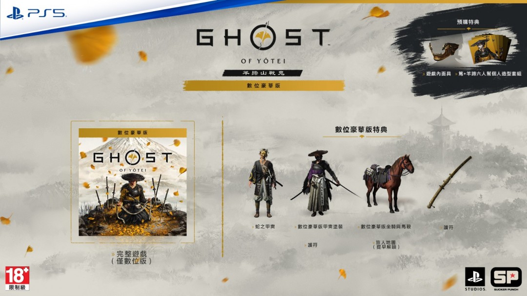 数字豪华版内含《羊蹄山之魂》数字版以及游戏内特典,包括蛇之甲冑,以及与初始甲冑不同的涂装。选购此版本还会获得独特的坐骑和马鞍配色,以及游戏内的护符、金色刀具和旅人地图的抢先解锁,协助玩家在这个世界中找到能升级技能的雕像。