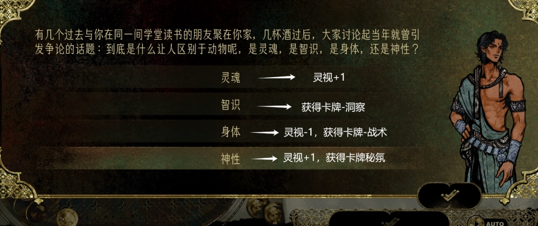 《苏丹的游戏》中事件选项决定了属性的变动,因此很多玩家不知道事件选项怎么选择,首先是到底是什么让人区别于动物呢,选择灵魂那么灵视就会+1,选择智识获得卡牌-洞察,选择身体灵视就会-1,获得卡牌战术。