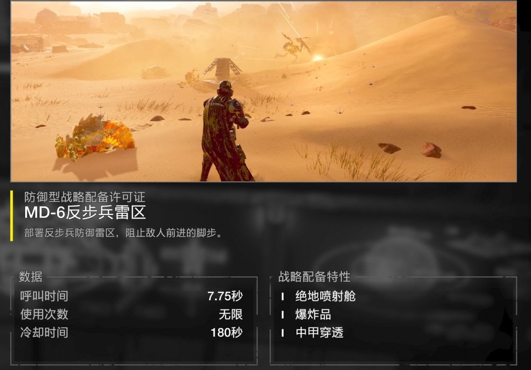 《绝地潜兵2》中的反步兵雷区是游戏里比较独特的战略武器,不过这个战略武器比较特别,并不算好用,反人地雷里理论上毒气地雷才是最好用的,然而炒鸡气球贪污了,如果你一定要用的话,请在防守设施中使用。
