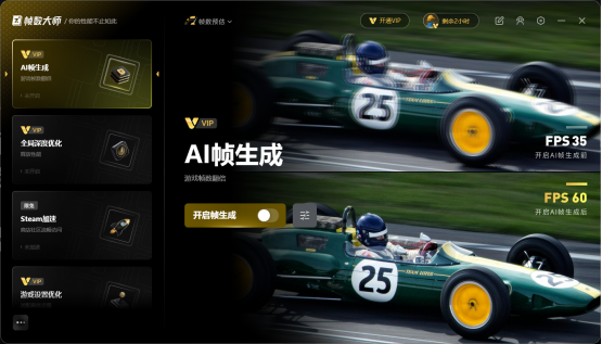 下载完成之后,打开帧数大师客户端,就可以使用啦,支持AI帧生成,通过AI在游戏过程中补帧,让我们的游戏更加丝滑。