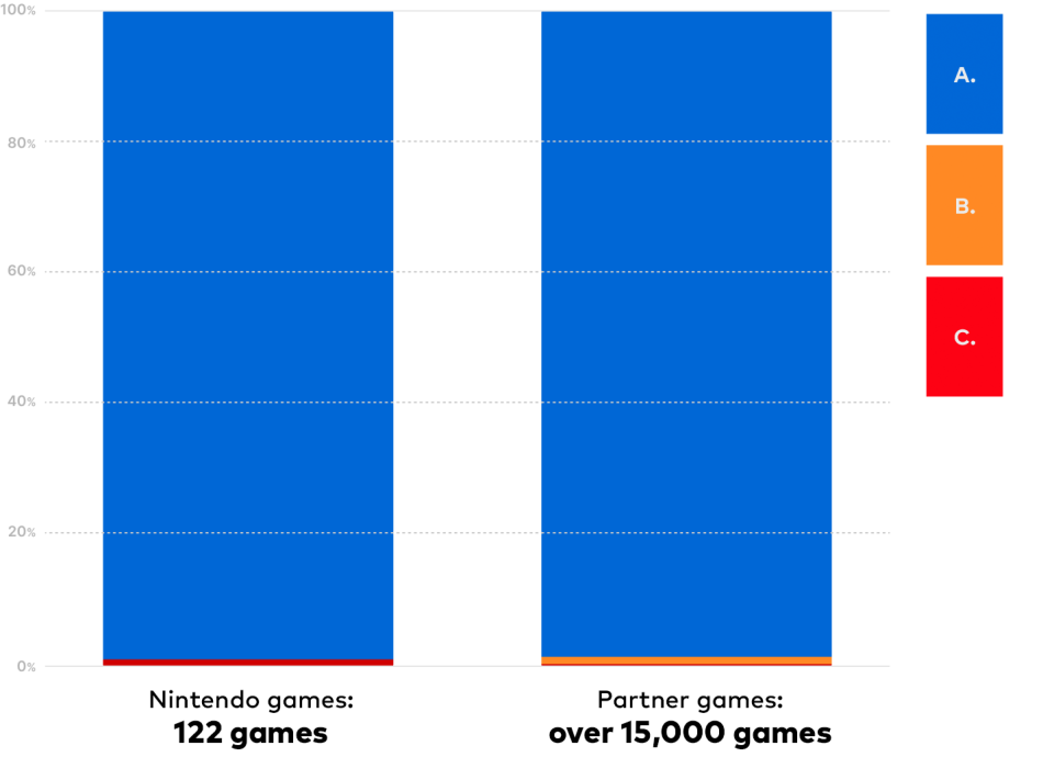 该兼容性数据来自任天堂为2025年6月5日发售更新的清单。在测试的大约15112款游戏和应用程序里,仅有6款被判定为完全无法运行,主要因为缺少相应的硬件或应用程序支持。其中包括hulu、Crunchyroll、Inkypen等服务,以及Nintendo Labo Toy-Con 04: VR Kit(外形不匹配)。