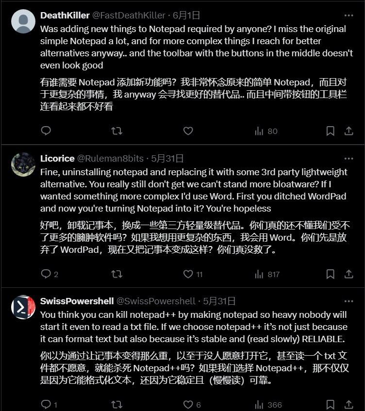 一位用户在X平台上发帖称:“团队,这是不必要的,我们已经有写字板了。记事本曾是一个防止意外重启的安全选择,但现在它已经被破坏了很多。”