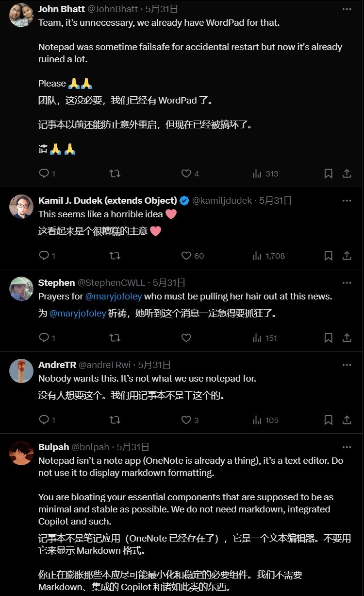 另一位用户补充道:“记事本不是一个笔记应用程序(OneNote已经存在),它是一个文本编辑器。不要用它来显示Markdown格式。你们正在使本应尽可能简洁和稳定的组件膨胀。我们不需要Markdown、集成的Copilot等功能。”