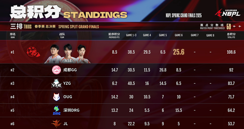 二轮回阳轮空。ASE再度获得四象之力加持,此时ASE已经来到12个淘汰分数。来到最后的决赛圈,ASE保持队伍整编,ASE.Mist(米斯特)张起灵也始终保有奥义,等待出手时机,关键时刻,黑金古刀果断出手,压制场面。同时,完壁光佑的魂玉也始终保持着ASE回复。最终,ASE站到了最后,成为这个春天NBPL的三排新王!!