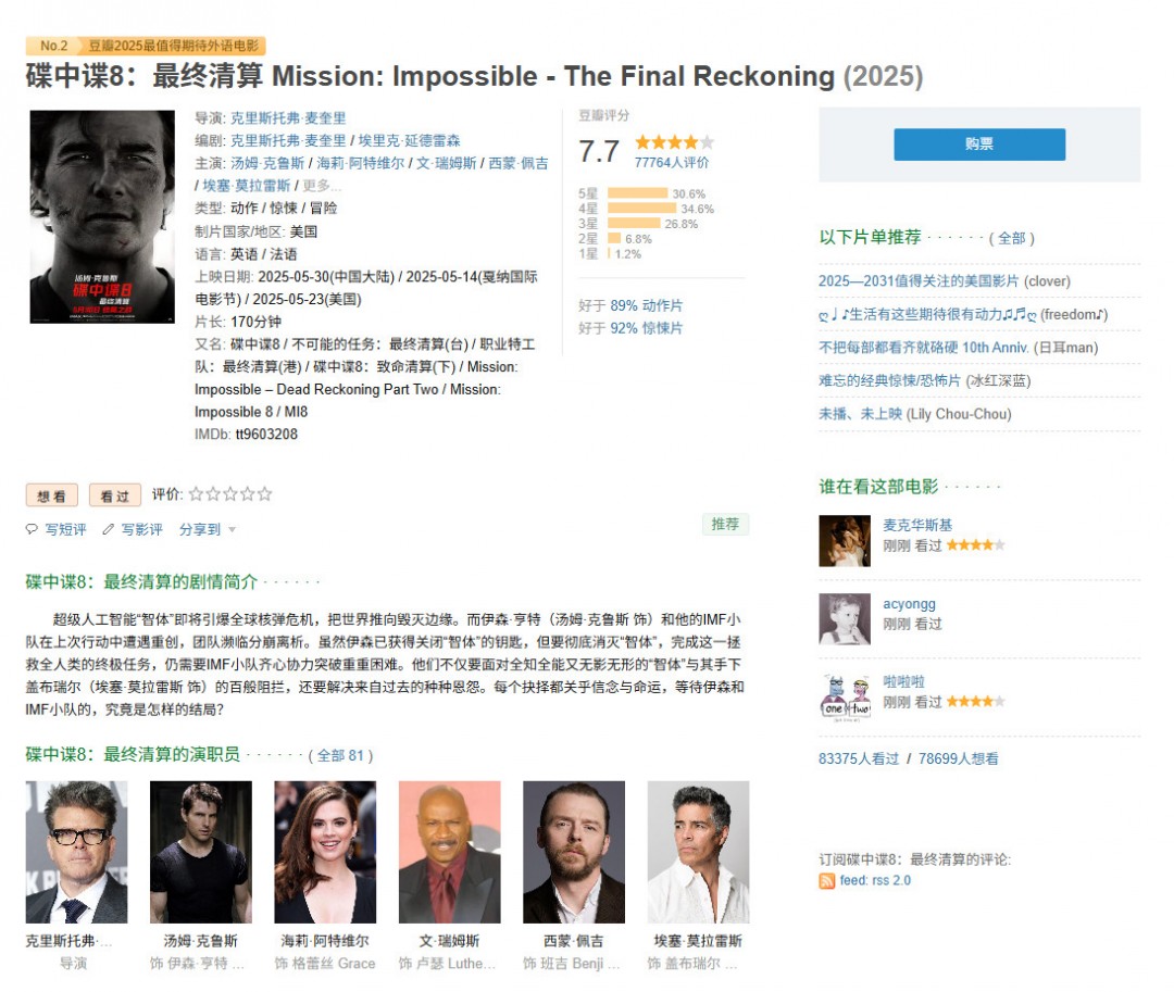 据外媒报道,阿汤哥主演的《碟中谍8》和迈克尔·B·乔丹主演的《罪人》,本周末全球票房都已突破3.5亿美元。不过《碟中谍8》于5月23日在北美上映,截至周末才十天左右,而《罪人》则是4月18日上映,这是该片上映的第七个周末。