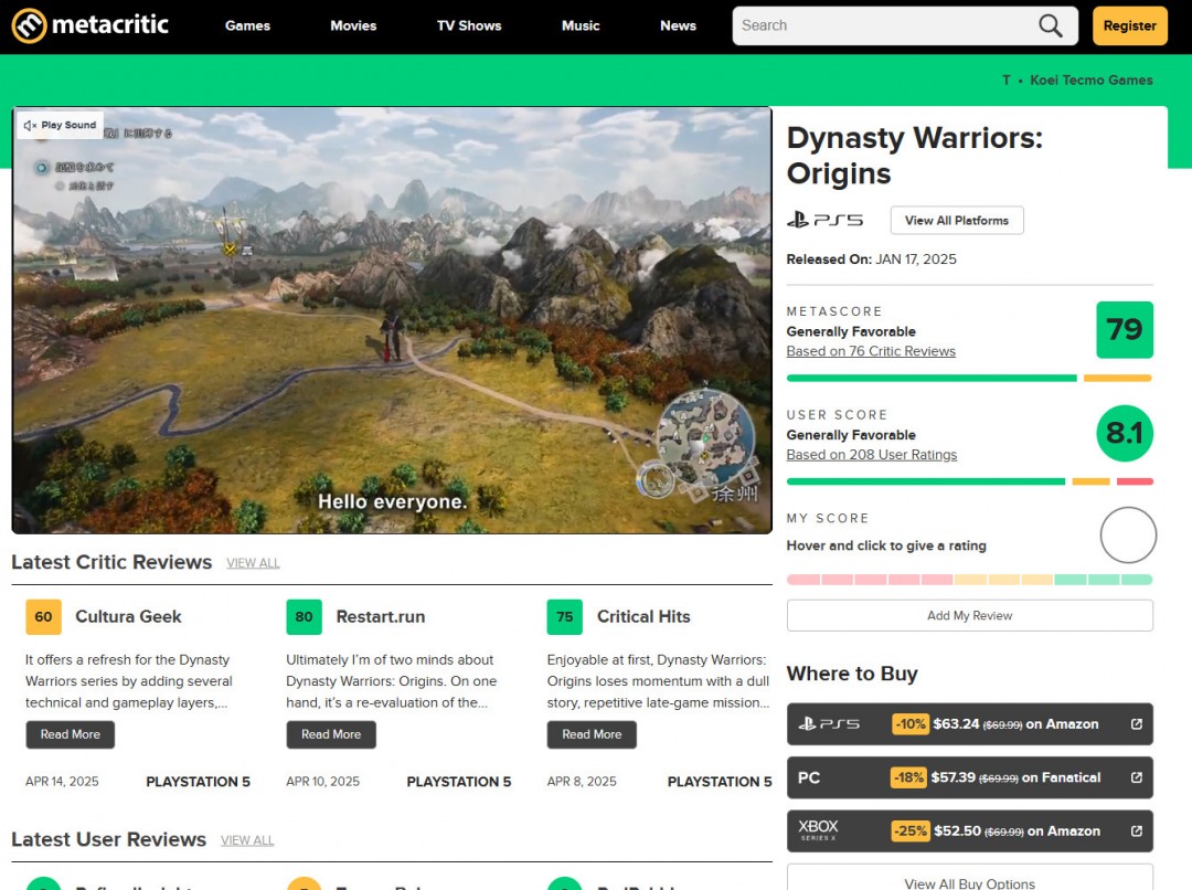 今年2月,发行商光荣特库摩在宣布,《真三国无双:起源》发售首月全球销量达到100万份。该作获得了媒体的普遍好评,目前在Metacritic上的评分根据平台不同在79分至84分之间。
