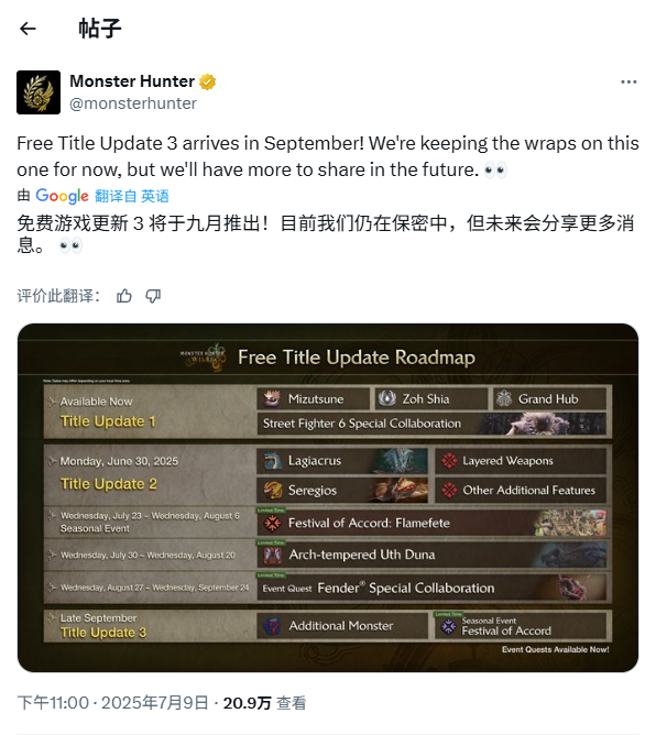 官方在推文中写道:“免费游戏更新3 将于九月推出!目前我们仍在保密中,但未来会分享更多消息。”