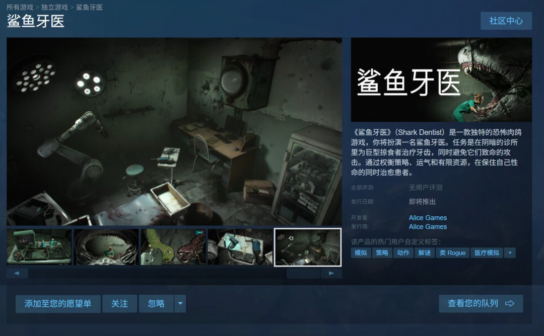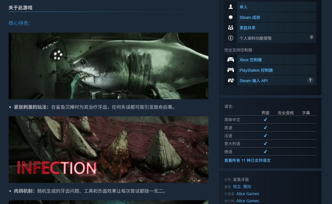 目前《鲨鱼牙医》已经上架Steam,自带简体中文。
