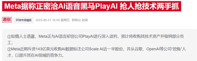 Meta方面,公司已完成对AI语音初创公司PlayAI的收购。有报道援引内部备忘录显示,PlayAI团队将于下周加入Meta,新成员将向Meta高管Johan