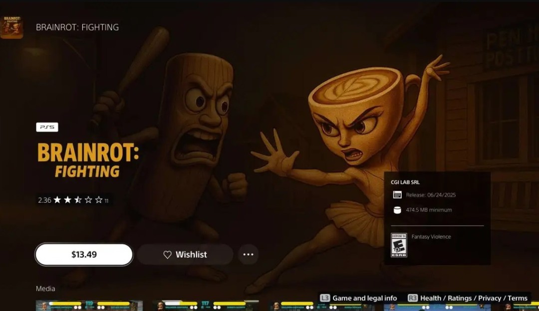 玩家指出,这些游戏在艺术资源方面存在典型的AI生成错误。例如,在《Brainrot: Fighting》的PlayStation商店页面背景图中,画面右侧角色的左手只有四根手指,而右手却是常规的五指,这类失误常见于未经修正的AI图像生成。同时,游戏实机演示画面也被批评为缺乏打磨,内容空洞。