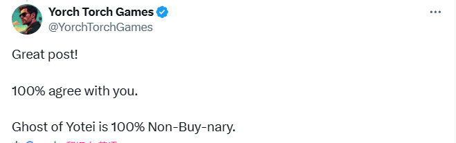 @Grummz发推说:“《羊蹄山之魂》游戏本身可能还不错,但根本没有理由选出这么一个主角来,除非是为了宣传他们的意识形态。