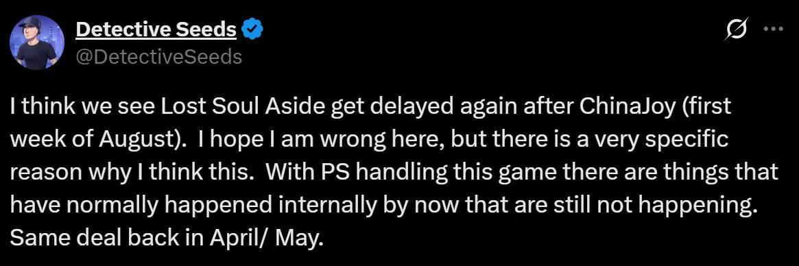 Seeds发推说:“我认为《失落之魂》在ChinaJoy(八月第一周)之后会再次延期。我希望我错了,但我这么想是有原因的。由于PS负责这款游戏,一些内部已经正常发生的事情现在仍然没有发生。四月/五月也是同样的情况。”